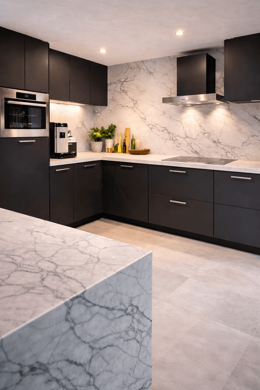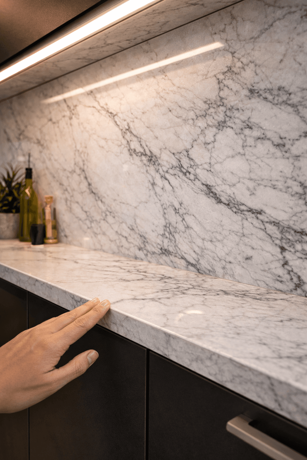 Luxe marmeruitstraling zonder de kosten van echt steen. Duurzaam, strak en perfect afgewerkt.